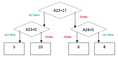 ЕСЛИ A22 = 1, A23 = -5, A24 = 6, результат равен 5.