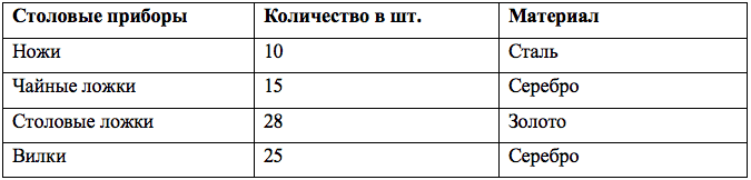 1. Количество серебряных столовых приборов.