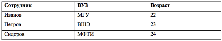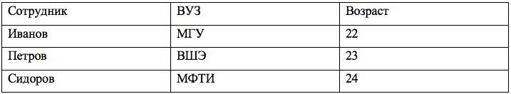 1. Возраст сотрудника Иванова (3 столбца)