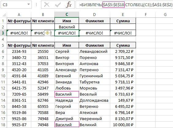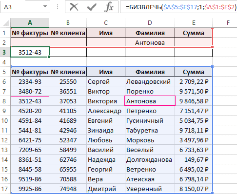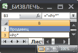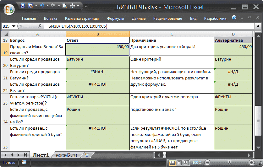 Формула = BIZVLECH (B10: B15; B10; B2: B3) вернет слово Рощин (что означает, что такая фамилия есть в диапазоне B10: B15 и она единственная, начинающаяся с Ro).