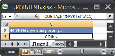 Значение, вычисленное по формуле, можно использовать в качестве критерия выбора. Формула должна возвращать ИСТИНА или ЛОЖЬ. Для этого введите формулу = EXACT («FRUIT»; A11) в ячейку C3 файла примера, а в C2 вместо заголовка введите произвольный пояснительный текст, например «FRUIT чувствителен к регистру» (заголовок не должны повторять названия исходной таблицы).