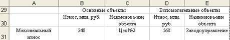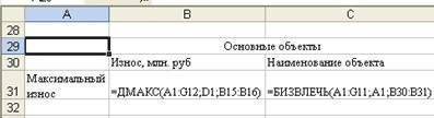 Рассчитайте максимальный износ для основного и вспомогательного объектов по аналогии с предыдущим действием, поместив функцию DMAX () в ячейки B31 и D31 соответственно.