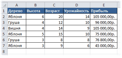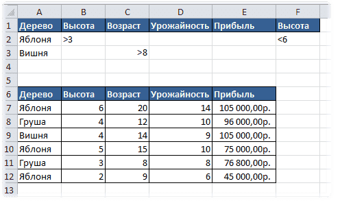 именно для этой таблицы будут предоставлены все примеры описания функций. И критерии устанавливаются следующим образом: выберите в поле «Дерево» яблони высотой больше 3 и меньше 6 и вишни со значением в поле «Возраст» больше 8. Если вы посмотрите таблицу данных (из которого будут выбираться данные, а вычисления будут выполняться функциями), поэтому этим критериям соответствуют только две строки: строки 9 и 10 листа.