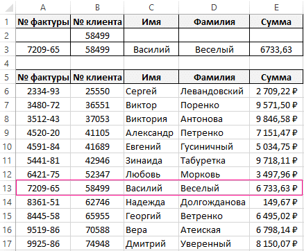 Несомненное преимущество использования функции BLUEL — автоматизация. Просто измените критерий, и в результате мы получим новую строку информации из клиентской базы компании. Например, теперь мы находим данные для номера клиента 58499. Удаляем старый критерий, вставляем новый и сразу получаем результат.