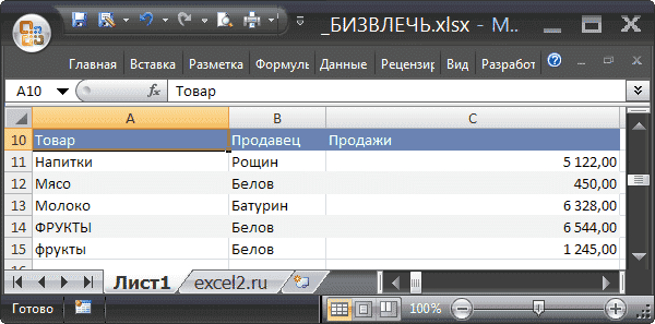 Предположим, что в диапазоне A 10: C15 есть таблица продаж (База данных), содержащая поля (столбцы) Продукт, Продавец и Продажи (см. Файл примера).