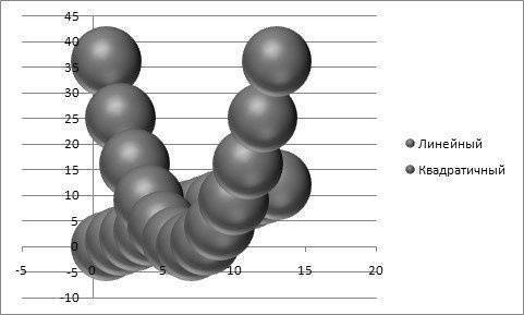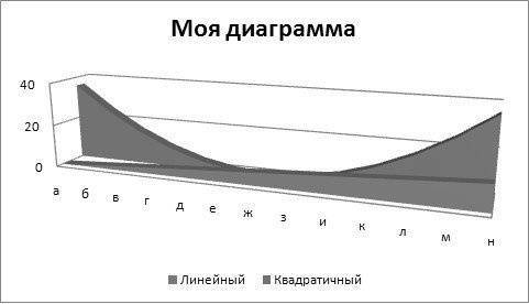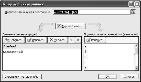 Серии данных добавляются в область «Записи легенды (серии)». Вы можете добавить строки из существующих в таблице или ввести данные вручную. В последнем случае эти данные будут отображаться на графике, а не в таблице. Уже существующие ряды данных отображаются в списке под кнопками. В нашем случае это линейный и квадратичный ряды. Кнопка «Добавить» позволяет добавить новую серию данных, кнопка «Изменить» — для редактирования существующей серии данных, а кнопка «Удалить» — для удаления серии данных.