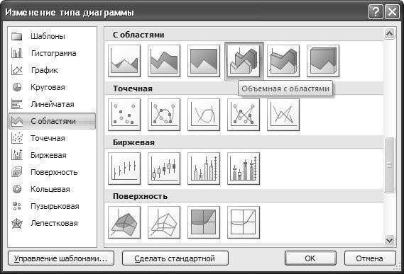 Чтобы было легче иллюстрировать дальнейшие методы работы с диаграммами, давайте изменим тип диаграммы. Выберите трехмерный график с областями типа C, как показано на рис. 6.8.
