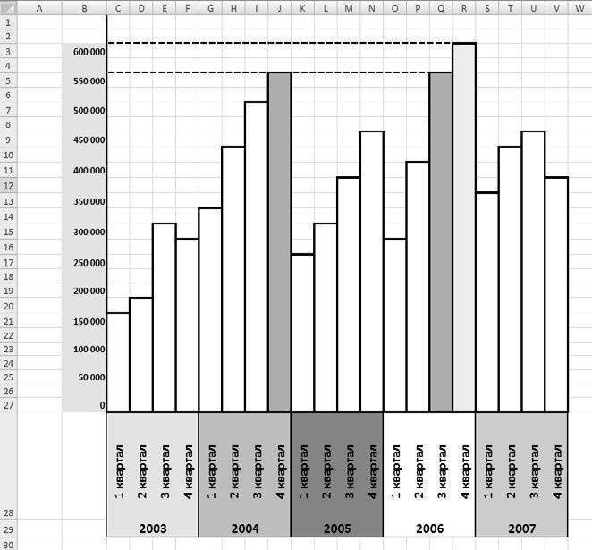 Само по себе наличие таблицы, разделенной на столбцы и строки, просто приводит к созданию простейшей плоской гистограммы из «подручного материала», то есть из текстуры самой таблицы. Допустим, нам нужно визуализировать динамику изменения объемов производства галош на резинотехническом заводе по кварталам за последние пять лет. В течение этого периода количество пар калош, выпущенных за квартал, колебалось от минимум 150 000 пар до максимум 600 000 пар. Это означает, что мы можем визуализировать эту диаграмму в осях, где вертикальная ось будет иметь 12 делений со значением деления 50 000 пар, а горизонтальная ось — 20 делений со значением деления 1 четверть плюс 5 дополнительных делений к началу года.