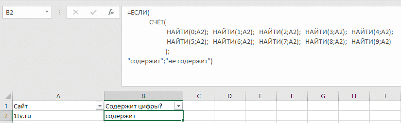 Чтобы проверить наличие цифр в строке, мы воспользуемся функцией ПОИСК.