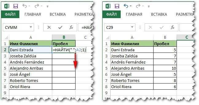 Наша задача — найти положение пробела относительно первого символа. Например, возьмем имя и фамилию Дани Эстрада и самостоятельно вычислим, где находится место. Пробел — это пятый символ, начинающийся с первой буквы. Теперь сделаем это автоматически с помощью функции НАЙТИ