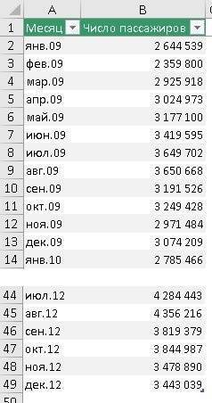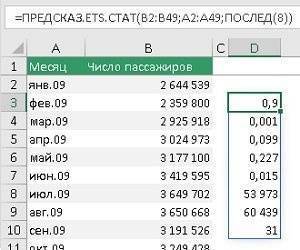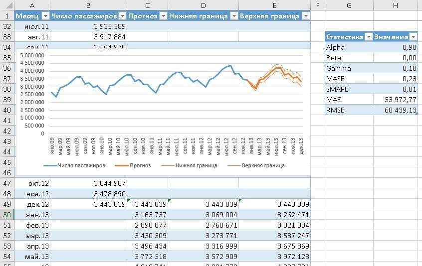 Второй аргумент — values = $ B $ 2: $ B $ 49. Исторические данные о пассажиропотоке можно найти здесь. Ссылка является абсолютной, поэтому при перетаскивании формулы ячейки, на которые указывает ссылка, не изменяются.