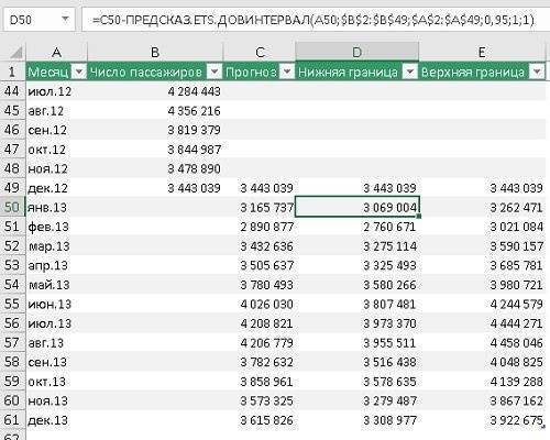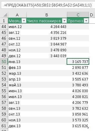 Первый аргумент — target_date = A50 — 13 января, то есть прогноз пассажиропотока на январь 2013 ищется в ячейке C50. C52 — до A52 и т.д.