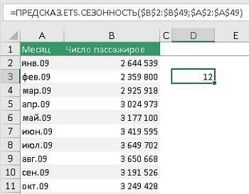 Здесь нет новых для нас тем. В простейшем случае FORECAST.ETS.SEASONALITY берет исторические данные и временную шкалу и возвращает целое число, равное сезонности. В нашем примере — 12: