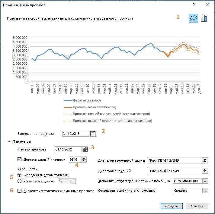 Здесь (1) вы можете выбрать тип диаграммы: диаграмма или гистограмма, (2) установить период прогноза, (3) выбрать начало прогноза на временной шкале; (4) выбрать значение доверительного интервала, (5) использовать параметр сезонности (число), определяемый функцией FORECAST.ETS автоматически, или установить сезонность принудительно, (6) указать, выводить ли статистику прогноза модели.