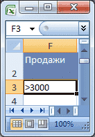 - В диапазоне F2: F3 создайте таблицу с критерием (рекомендуется размещать таблицу над исходной таблицей, чтобы она не мешала добавлению новых данных в таблицу), состоящую из заголовка Sales (совпадает с названием заголовка столбца исходной таблицы, к которой применяется критерий) и самого критерия (условия выбора)> 3000.