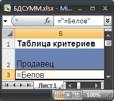 - Условие выбора должно быть записано в специальном формате: = «= Belov» (будут суммированы только Продажи строк, для которых столбец Vendor будет содержать именно слово Belov (или belov, beLov, т.е исключая РЕГИСТРАТОР). Продавцы «ИванБелов», «Белов Иван» и др., поэтому сумма по ним не выплачивается.