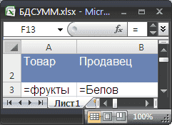 - напишите саму формулу = BDSUMM (C8: C13; C8; F2: F3) Предполагая, что Database_Database (исходная таблица) находится в C8: C13 (столбцы A (Продукт) и B (Продавец) могут быть опущены в этом случае в базе данных, то есть (при условии, что они не участвуют в критерии выбора и суммирование по ним не проводится). C8 — это ссылка на заголовок столбца, на основе которого будет выполняться сводка (т е столбец Продажи) . F2: F3 — ссылка на табличку критериев