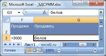 Находим, что сумма продаж> 3000 только у продавца Белова. Вы должны выбрать строки, у которых есть Belov в столбце «Продавец» и значение> 3000 в столбце «Продажи», а затем просуммировать значения продаж в выбранных строках (см. Также статью об условии I).