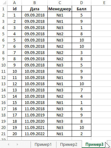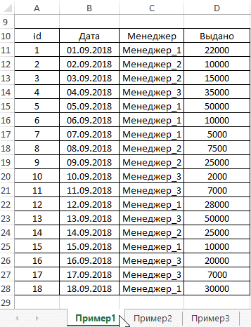 Пример 1. В таблице записаны данные по кредитам, выданным клиентам менеджерами банка за несколько дней. Определяет размер средств, предоставленных менеджером_1 и менеджером_3 на весь период.