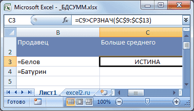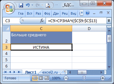 Для этого введите формулу = C9> AVERAGE ($ C $ 9: $ C $ 13) в ячейку C3 файла примера, а в C2 вместо заголовка введите произвольный пояснительный текст, например «Больше среднего. «(название не должно повторять названия исходной таблицы).