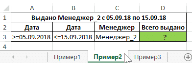 Пример 2. Используя таблицу из первого примера, определите общую сумму кредитов, выданных вторым менеджером в период с 5.09 по 15.09?