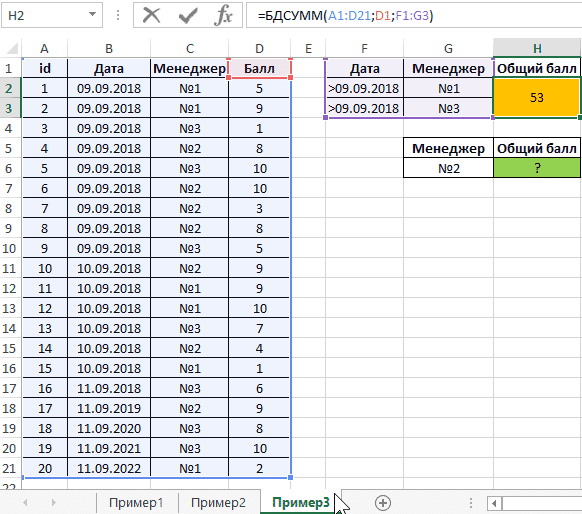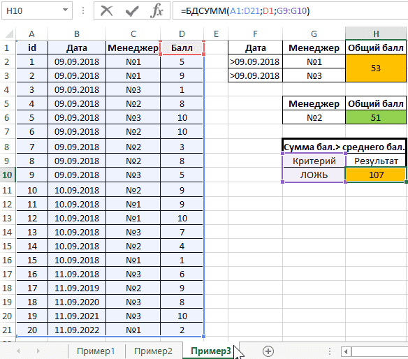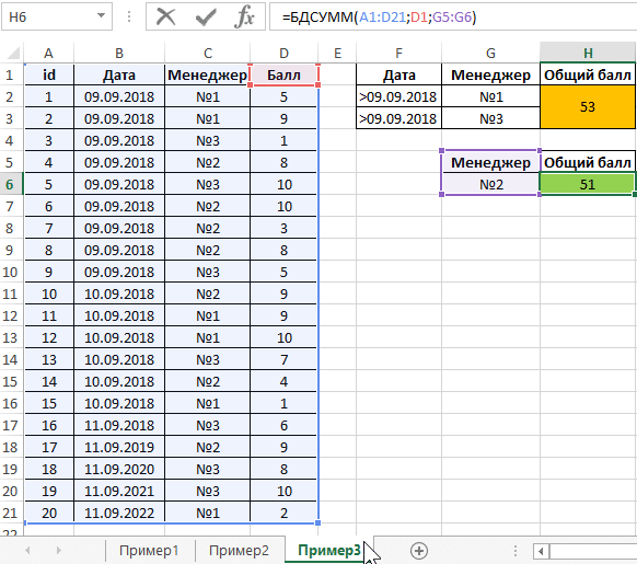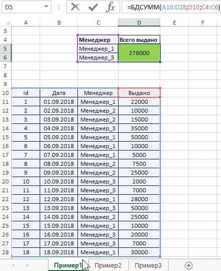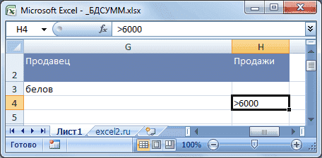 Пример функции БДСУММ для суммирования по условию в базе Excel