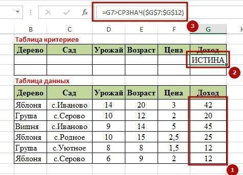Итак, для начала рассмотрим простой пример с числовым критерием, для этого выбираем столбец «Урожай» и указываем, что нам нужны деревья с урожайностью «> = 10». Для получения результата нам понадобится такая формула (я рекомендую использовать абсолютные ссылки):