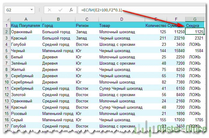 Мы вставляем функцию ИЛИ как условие в функцию ЕСЛИ. В нашем случае, если регион покупателя — Восток или Юг, отгрузка считается экспортной.