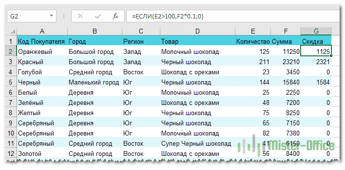 Мы называем столбец H «Скидка», а в ячейку H2 вводим функцию ЕСЛИ, вторым аргументом которой будет формула для расчета скидки.