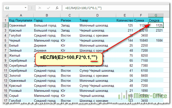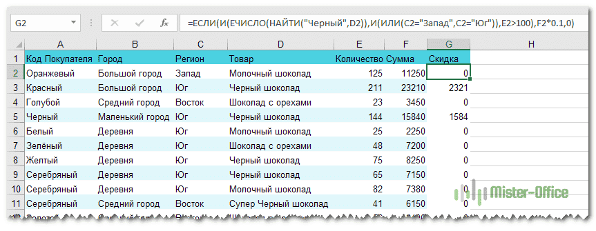 И (ИЛИ (C2 = «Запад», C2 = «Юг»)), E2> 100), F2 * 0,1,0)