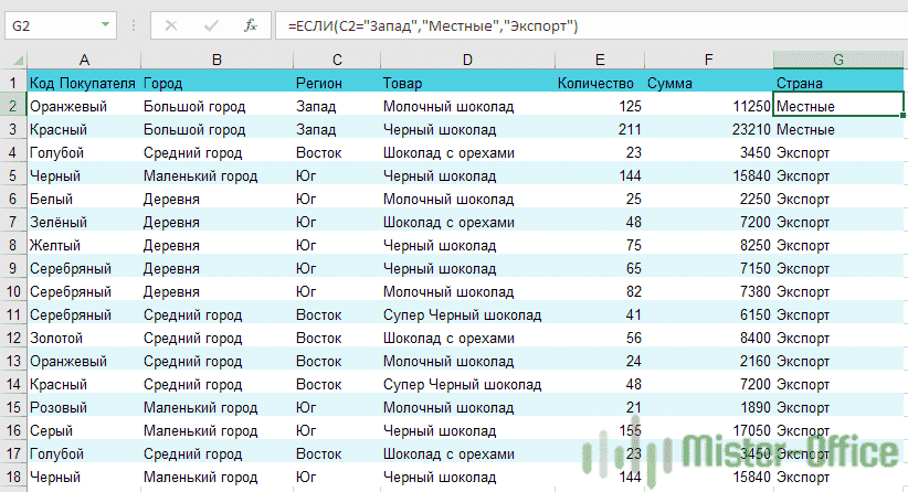 = IF (C2 = «Запад», «Местный», «Экспорт»)
