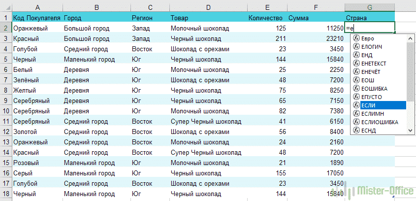Установите курсор в ячейку G2 и введите знак «=». Для Excel это означает, что формула будет вставлена. Поэтому, как только буква «е» будет нажата дальше, мы получим предложение выбрать функцию, которая начинается с этой буквы. Выбираем «СЭ”.
