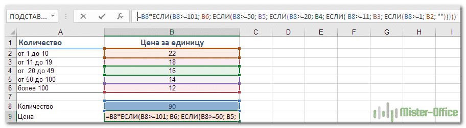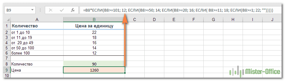 Вот еще одна типичная проблема: цена за единицу продукта меняется в зависимости от количества. Ваша цель — написать формулу, которая вычисляет цену для любого количества предметов, введенных в определенную ячейку. Другими словами, ваша формула должна проверять разные условия и выполнять разные вычисления в зависимости от диапазона суммы, к которой относится указанное количество товаров.