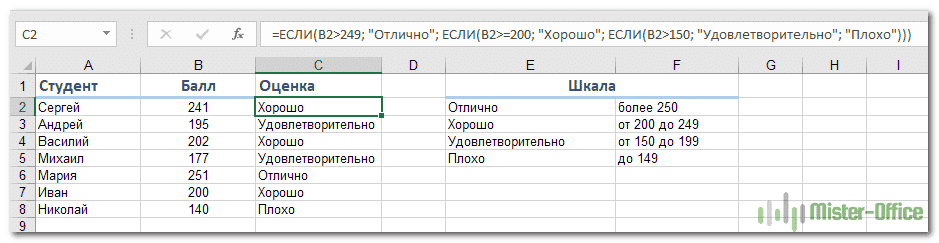 = ЕСЛИ (B2> 249; «Отлично»; ЕСЛИ (B2> = 200; «Хорошо»; ЕСЛИ (B2> 150; «Удовлетворительно»; «Плохо»)))