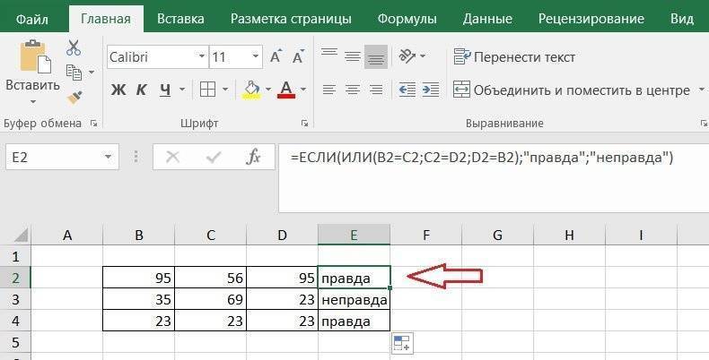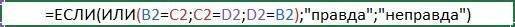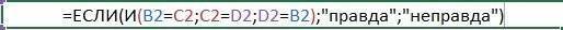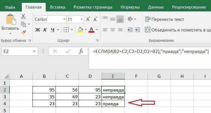 Сравните ячейки B2 с C2, C2 с ячейкой D2 и D2 с ячейкой B2. Только если все числа в этих ячейках равны, функция возвращает истину. Как видно из примера, только в нижней строке таблицы (строка №4) функция ЕСЛИ вернула значение «истина», поскольку в этой строке все числа равны друг другу.