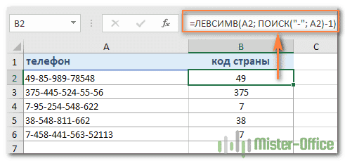 Точно так же вы можете извлечь коды стран из столбца телефонных номеров. Единственное отличие состоит в том, что теперь вам нужно знать положение первого тире («-«), а не пробел: