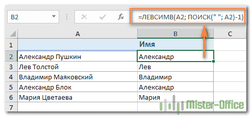 Предполагая, что полное имя находится в ячейке A2, позиция пробела возвращается по этой простой формуле: ПОИСК («»; A2)). Теперь введите это выражение СЛЕВА: