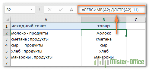 Думаю, вы понимаете, что с помощью этой универсальной формулы можно получить подстроку, которая предшествует любому другому символу:
