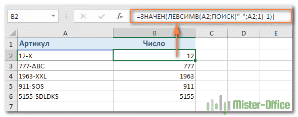 Например, чтобы извлечь символы перед разделителем «-» из A2 и преобразовать результат в число, вы можете сделать это: