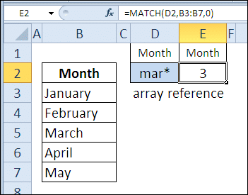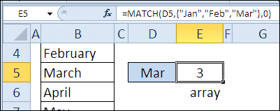 вы можете использовать массив констант в качестве аргумента для lookup_array (lookup_array). В следующем примере месяц поиска вводится в ячейку D5, а названия месяцев подставляются в качестве второго аргумента функции ПОИСКПОЗ в виде массива констант. Если вы введете следующий месяц в ячейку D5, например, октябрь (октябрь), функция вернет # Н / Д (# Н / Д).