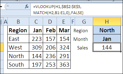 Чтобы придать функции ВПР большую гибкость, вы можете использовать ПОИСКПОЗ для поиска номера столбца вместо кодирования его значения в функции. В приведенном ниже примере пользователи могут выбрать область в ячейке H1, это значение поиска для ВПР. Затем они могут выбрать месяц в ячейке H2, и функция ПОИСКПОЗ вернет номер столбца, соответствующий этому месяцу.