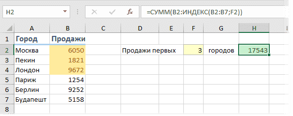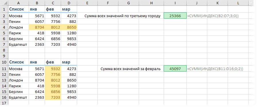 Обратите внимание, что, поскольку ИНДЕКС не предоставляет конкретное значение ячейки в этой версии, а представляет собой ссылку на диапазон, для его вычисления вам нужно будет заключить его в дополнительную функцию, такую как СУММ, СРЕДНЕЕ и т.д.