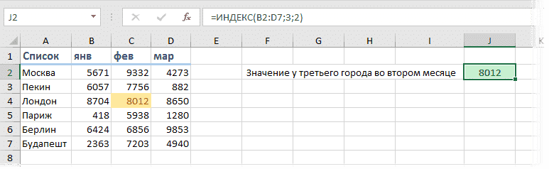 Эта функция извлекает значение из ячейки в диапазоне на пересечении строки и столбца с заданными числами.