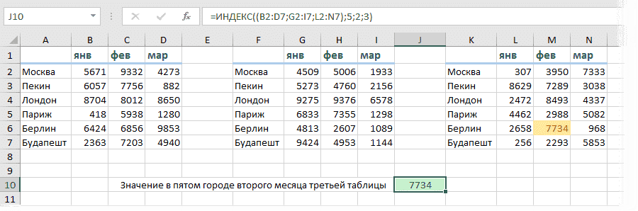 Если таблицы нет, но их много, функция ИНДЕКС может извлекать данные из необходимой строки и столбца указанной таблицы. В этом случае используется следующий синтаксис: