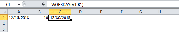 Где A10 — дата начала, а C1 — количество предыдущих (отрицательные числа) или следующих (положительные числа) рабочих дней, за исключением праздников.