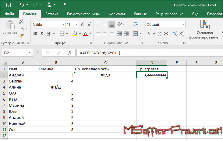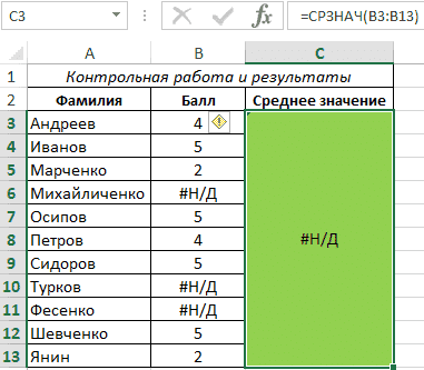 В результате формула вернула правильное среднее значение, игнорируя ошибки # N/A.