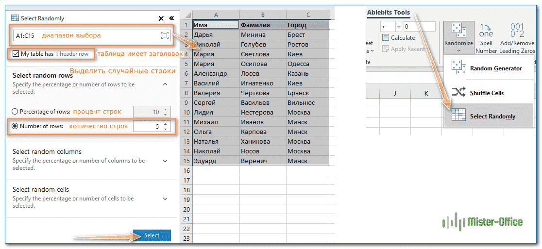Как случайно выбрать в Excel с помощью инструмента Randomize.
