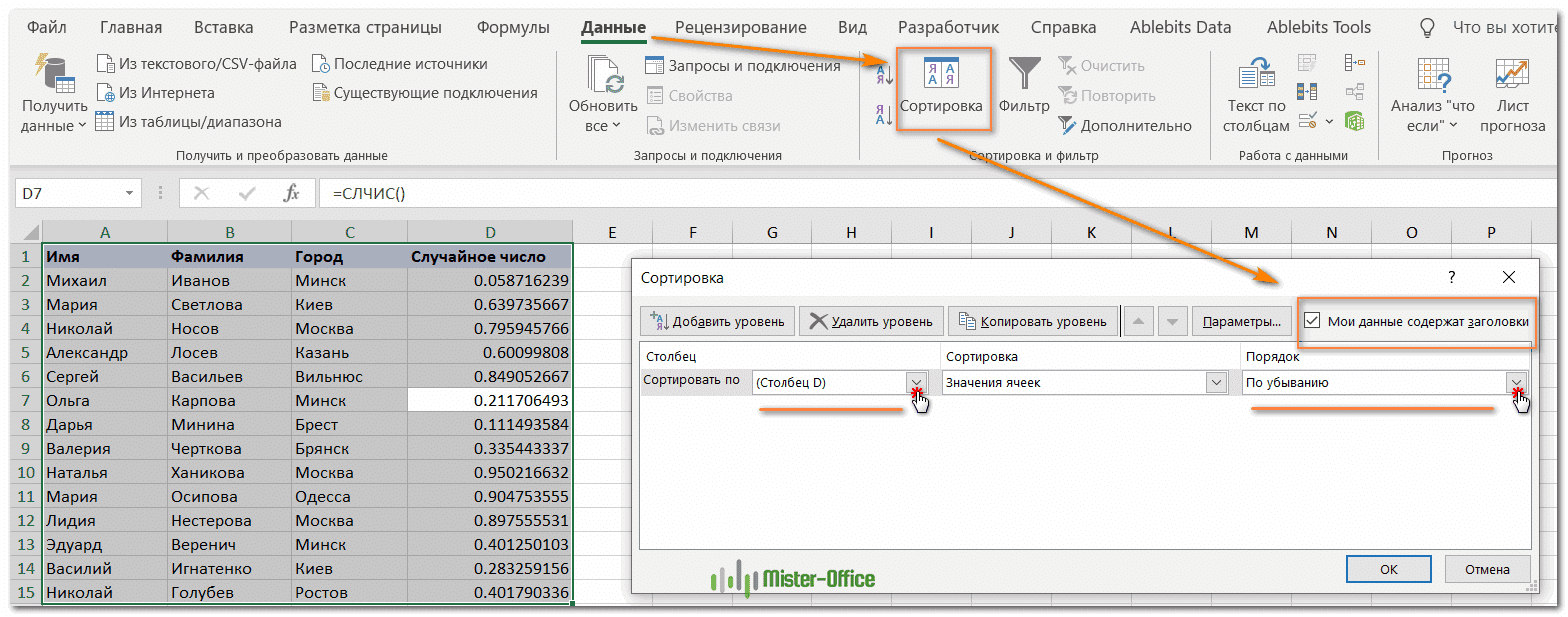 Для экономии времени можно использовать кнопки сортировки AY или YA, но курсор необходимо поместить на столбец с формулой RAND (). Заголовок столбца рекомендуется писать на русском языке, иначе есть возможность перейти в конец таблицы.
