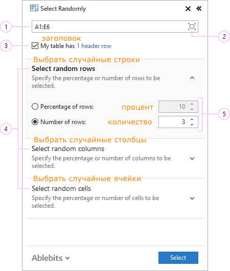 - Пройдя через панель надстройки, выберите то, что вы хотите получить: случайные строки, столбцы или ячейки.