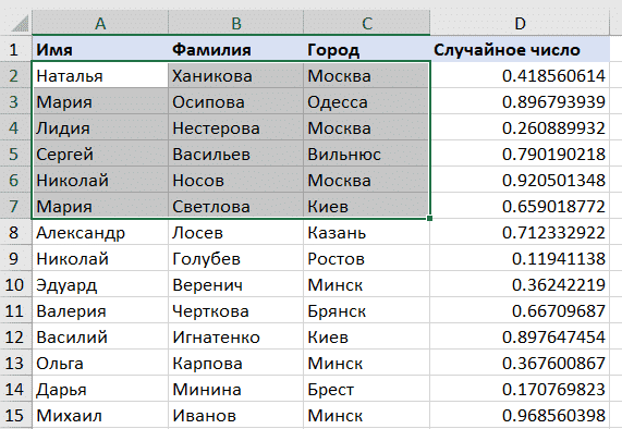 Пусть вас не смущает то, что после сортировки по столбцу D вы видите в нем номера совершенно не по порядку. Дело в том, что сортировка изменяет порядок строк, и поэтому все формулы RAND () пересчитываются заново. Но наша работа не в том, чтобы сортировать, а в случайном перемешивании строк, не так ли?